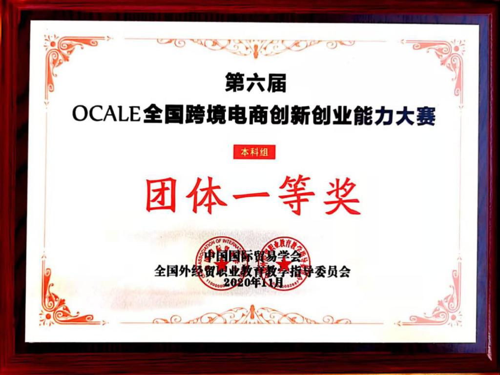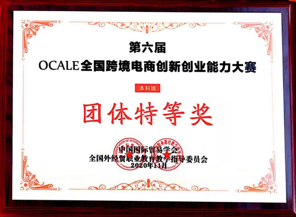 11月4日由全国外经贸职业教育教学指导委员会和中国国际贸易学会共同举办的第六届OCALE全国跨境电商创新创业能力大赛圆满落幕。beat365官网beat365唯一官网国际经济与贸易专业学生组成六支代表队,在籍丹宁和刘黎明老师的指导下,从全国108所本科高校342支队伍中脱颖而出,最终由陈虹、沈茂菊、韩冬冬、欧冰冰、宋欣、张文佳、张世泽、王春月、叔馨悦、赵开旗、辛璞、沈松松等学生组成的四支队伍获得团体特等奖;杨顺、王烨菲、周红宇、白梦蝶、金国栋、苏媛等学生组成的两支队伍获得团体一等奖。