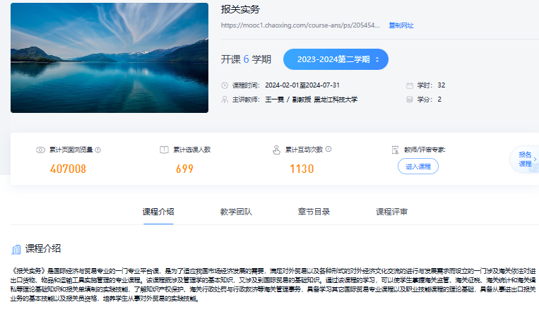 课程在超星线上平台开放,2019年秋冬在超星学习通上线,截止到2024年被15所院校引用,累计浏览量406766次。校内学生选课25个班级699人,校外学生使用22个班级375人。课堂活动359个,讨论区话题1082个。本课程强调知识集群,模糊学科边界,注重大数据在“报关实务”课程中的应用,合理布局章节, 推进多学科深度融合。“报关实务”课程也受到同行们的认可并在教学中应用和推广,在广大学生中也引起了共鸣。本课程对传统“报关实务”课程进行转型、改造和升级,实现在学科领域的新突破,实现理论创新、机制创新、模式创新。