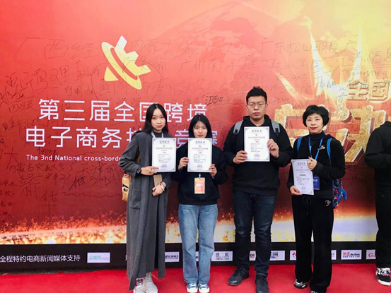 2019年12月6日至8日由中国对外经济贸易经济合作企业协会主办,中国商业经济学会协办的“第三届全国跨境电子商务技能竞赛”在广西南宁职业技术学院举行,beat365官网beat365唯一官网国际经济与贸易专业学生16级施晟和孙亚苹,17级李卓倩同学组成的Polaris战队在指导教师籍丹宁、刘黎明带领下,经过7个月的努力,在来自全国105支队伍中表现优异,最终在39支本科组院校中排名第六,取得了一等奖的优异成绩。